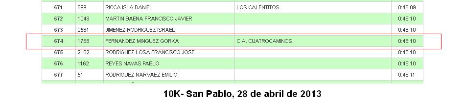 Hice 46:03 por mi reloj 46:10 según la organización, el desfase de 7 segundos tiene que ver con el pase del codigo de barras del dorsal (no había chip).